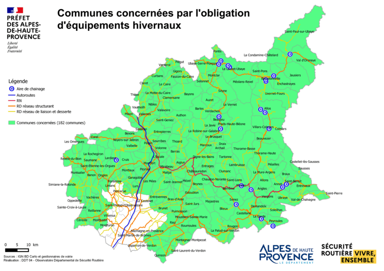 Dans les Alpes-de-Haute-Provence, du 1er novembre au 31 mars, vous devrez détenir des chaînes à neige ou équiper votre véhicule de pneus hiver.